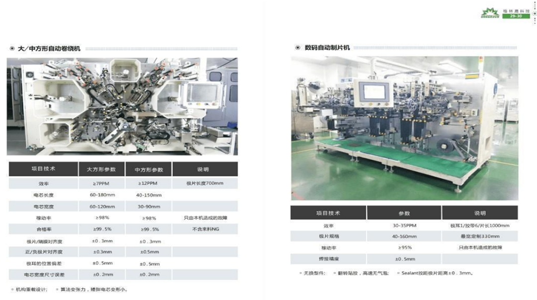 據(jù)了解,格林晟已形成疊片、卷繞、注液等具有自主知識產(chǎn)權(quán)的產(chǎn)品序列,業(yè)務(wù)覆蓋國內(nèi)外市場。作為國內(nèi)唯一能夠?qū)崿F(xiàn) 590 長電芯單片突破 0.6 秒的設(shè)備制造企業(yè),格林晟的疊片機國內(nèi)市場份額多年領(lǐng)先,注液機處于行業(yè)前三,卷繞機也位居行業(yè)前列。目前,公司已擁有深圳、江門、武漢、合肥等多個研發(fā)、生產(chǎn)基地,擁有鋰電制造相關(guān)的疊片機、卷繞機、注液機、物流線等核心產(chǎn)品技術(shù),實現(xiàn)了方形、圓柱、軟包電池的全覆蓋,可提供完善的鋰電單體設(shè)備工業(yè)化解決方案,以及中段全自動化設(shè)備方案和整線設(shè)計方案,能滿足下游客戶的多元化需求。